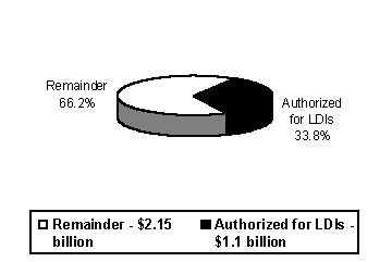 Nine LDIs are direct loans or loan programs, four more involve the purchase of loans, three are bond guarantee programs, eight involve the purchase of bonds, and two are deposit programs. Authorizations range from a low of $2 million to a high of $275 million, although only four LDIs are authorized for $100 million or more. For more detail on the individual LDIs, refer to Chapter 2 of this report.