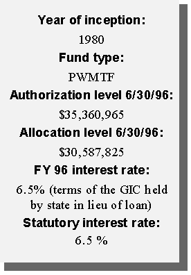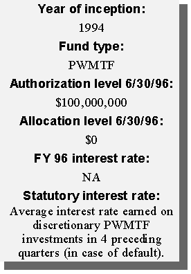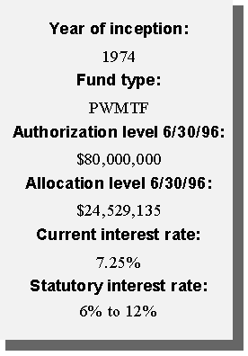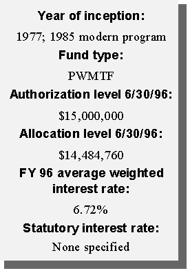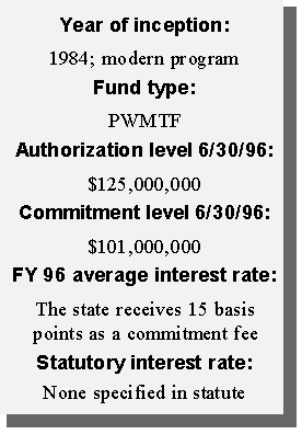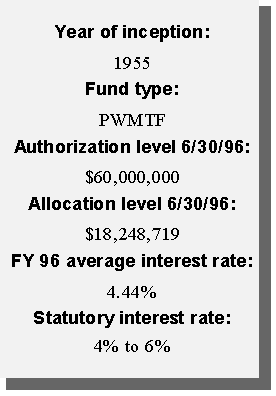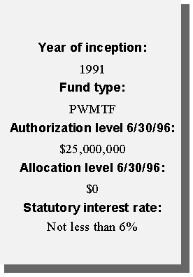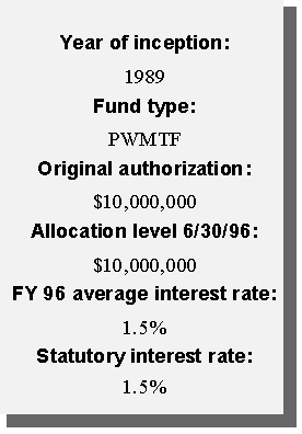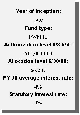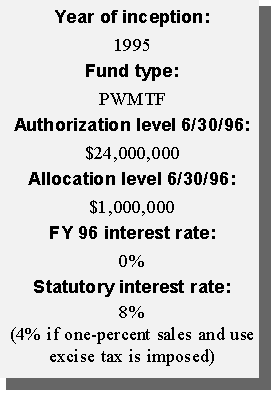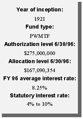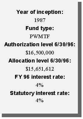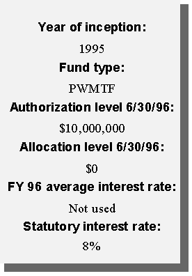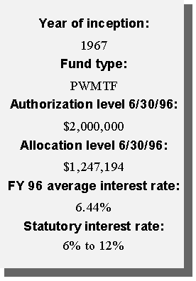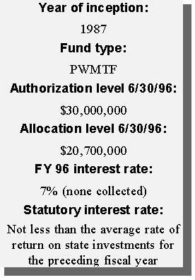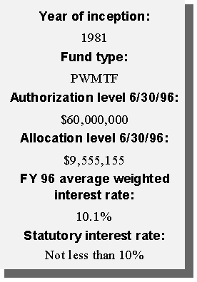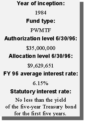 Another innovative financing approach taken by the state was the creation of a permanent source of funding for water pollution control needs. Using federal capitalization grants accompanying the Clean Water Act and the required 20 percent state match, the state created a revolving loan fund (SRF). Currently, the SRF has a balance of approximately $12 million available to local governments in reduced-rate loans for projects such as waste water treatment plants, storm water treatment, and non-point source pollution projects. Additional amounts will be available as current borrowers repay their loans.